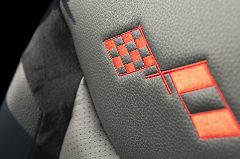 Pommeau de levier inverseur, insert volant, accoudoirs et vide-poches de porte, console centrale, grille d’aération de tableau de bord, fond de compteur rouges